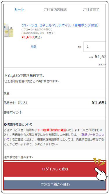 【2】カートに入れた商品をご購入いただくには「ご注文手続きへ進む」をタップしてください。会員情報登録することで、次回ご利用時にお名前やご住所を入力しなくてもご注文いただけます。