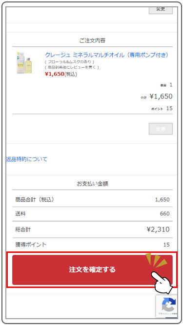 【3】お届け先ご住所、お支払い方法をご入力後、ご注文内容に相違がなければ「注文を確定する」をタップしてください。