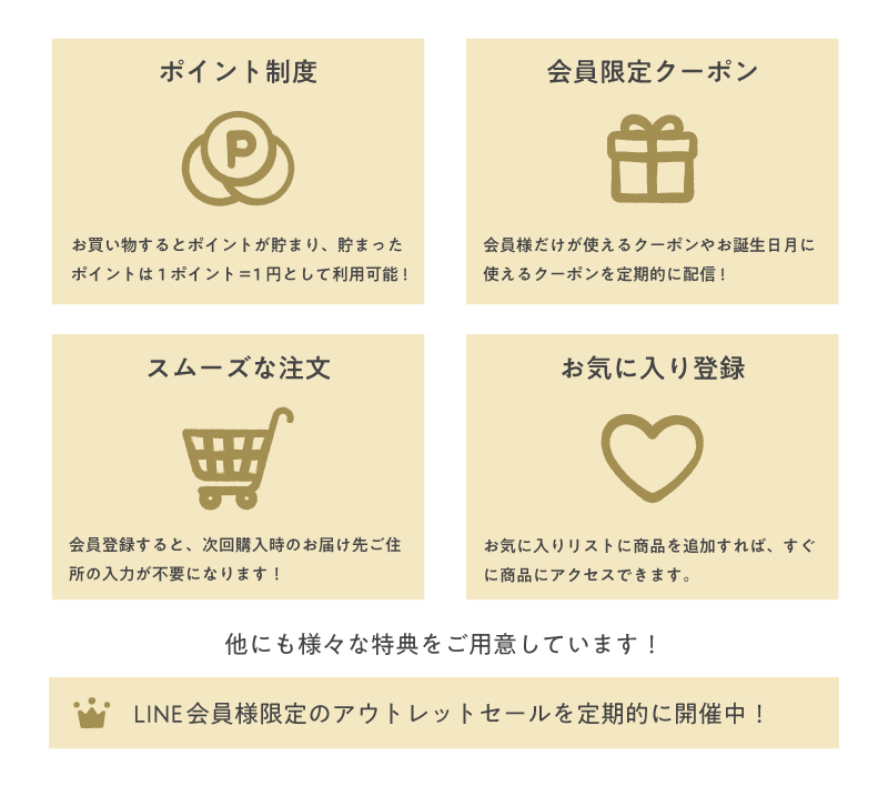 皆様によりお買い物を楽しんで頂けるよう、お得な会員特典をご用意しております。